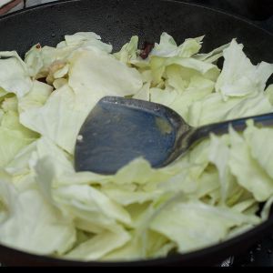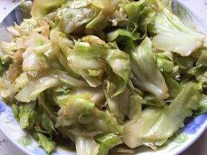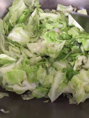 倒入包菜翻炒 加入盐炒至菜叶变软加入生抽