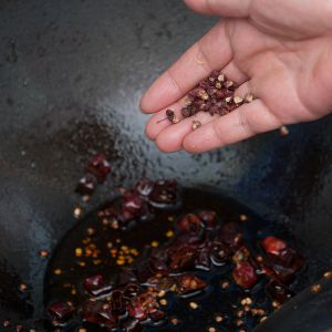 干辣椒切段,锅中油热后放入炒香,加花椒一起炒。