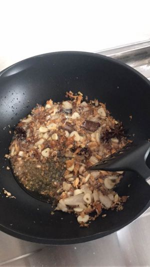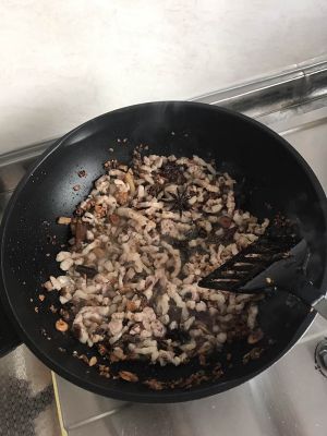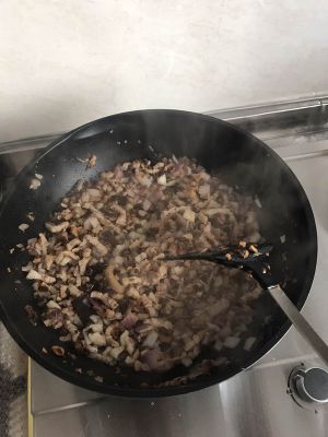 五花肉切小块,放进锅里翻炒出油,下水发的干香菇炒香,下炒好的红洋葱