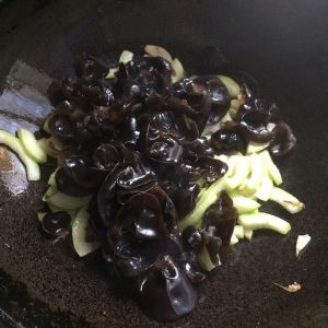 待木耳和西葫芦炒软后加入鸡蛋翻炒均匀