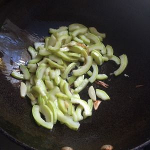 锅内加入丝瓜、木耳、鸡蛋进行煸炒,放入少许料酒、盐、糖炒至成熟。