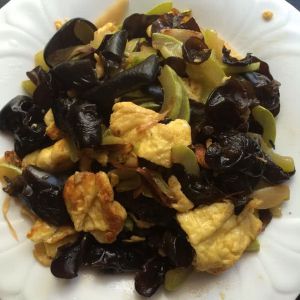 锅里倒入适量的油,加热后,倒入蛋液,凝固后加入木耳、青椒、豆瓣酱、生抽翻炒,熟后装盘。