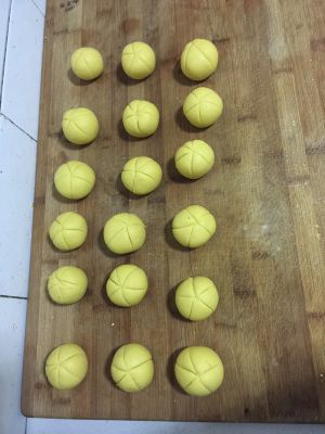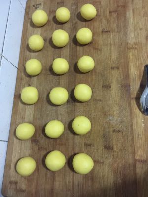 把揉好的面团分成若干个大小差不多乒乓球大小的面团,再揉成圆(面团里面可以包豆沙馅儿同样很好吃)~