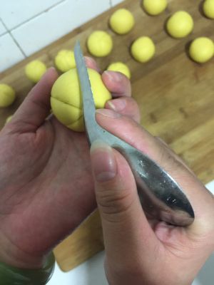 把所有的面团都用勺子的柄在面团上压几道像南瓜的印子