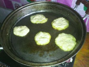 面用手挤成一小块然后压扁、平底锅加热放油煎熟就可以了,最后装盘再倒点练乳在上面