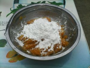把面粉、玉米粉、白糖放入南瓜泥中。注意白糖不能放太多,太甜了对孩子牙齿不好。
