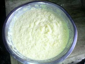 加入清水,搅拌成面糊,注意面糊不能太稀了,不然做出来的南瓜饼太软,味道也不好。