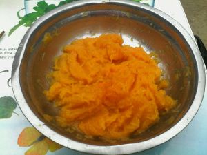 南瓜饼去皮切片蒸熟、放盆里捣碎加糯米粉加糖和面、