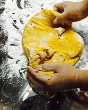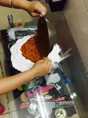 加入糯米粉(因为南瓜出水和糯米粉吸水量不同,根据情况增减)