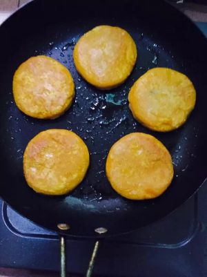 油烧开后放去做好的南瓜饼改成中小火,两面炸成金黄色即可开吃了!