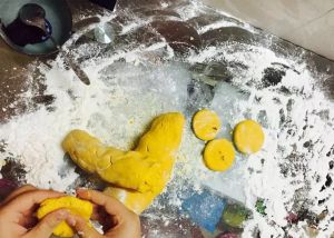 把面团分成像鸡蛋般大小的剂子,有手掌压平,中间用刀子划两个口,两面裹上白芝麻货椰蓉。