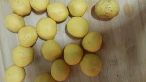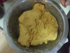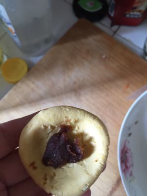 第五步,南瓜粉揉成乒乓球大小后里面在放红豆沙。