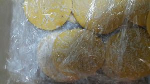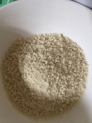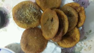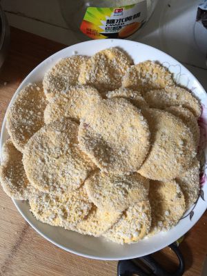 第七步,将红豆南瓜球拍成饼后,两面沾点面包糠,放冰箱速冻