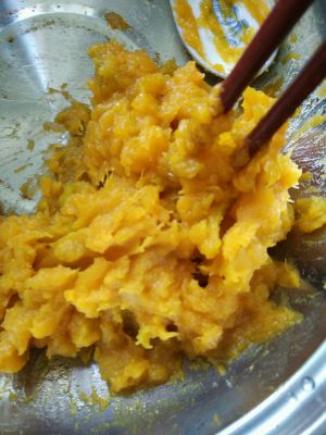 一个不是很大的南瓜我用了1/3,切成一厘米厚的块状,放入微波炉大火叮10分钟,拿出来压成泥。