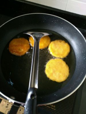 上油锅把料捏成饼状煎成金黄色即可出锅。好吃极了!