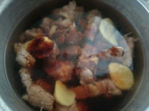 电饭锅里放入肉和水,先烧开后洗干净后,锅内放水和肉,再放入生姜,料酒(大概50ml),老抽(海天草菇老抽,大概10ml),煮大概45分钟左右,将肉捞出