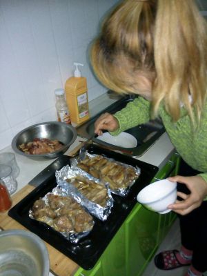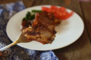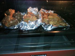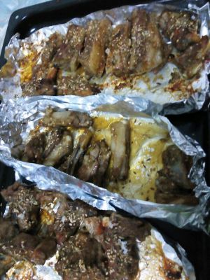 然后翻面又继续220°烤了20分钟,最后把肥的一面翻回来,刷上一层蜂蜜,盖的锡纸去掉,然后继续200°烤了15分钟