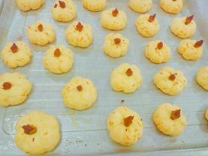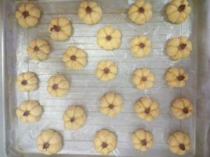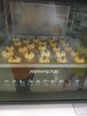 和好的面团分成25克的小剂子,芋泥也分成25克。南瓜面团象包汤圆一样把芋泥包好滚圆。用牙签或刮板在上面压米字,用枸杞做南瓜柄。