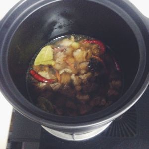 将翻炒好的牛肉倒入炖锅,加入姜、桂皮、八角、冰糖、香叶和适量的热开水,要没过牛肉,大火烧开后小火炖1个小时。