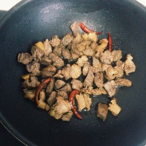 干净炒锅放适量油,先后加入牛肉、干辣椒、生抽、料酒,煸炒待牛肉上色后关火。