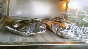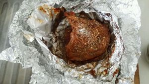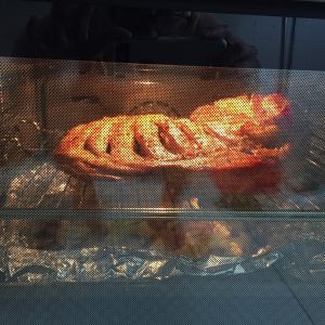 60分钟后取出,撕开表层锡纸,根据自己口味撒上辣椒粉、孜然、盐再继续烤20分钟,外焦里嫩即可