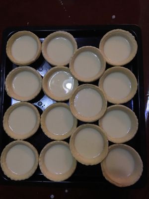 蛋挞水过筛一两遍后加入蛋挞皮。蛋挞水加入九分满就可以啦,因为蛋挞皮在烘焙过程中会回缩,加满蛋挞水就会溢出来。