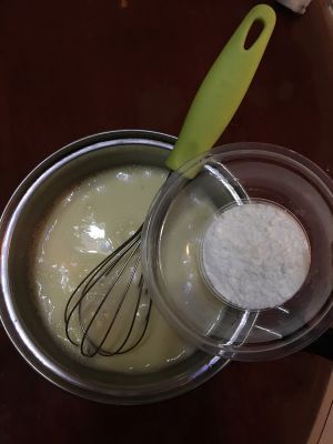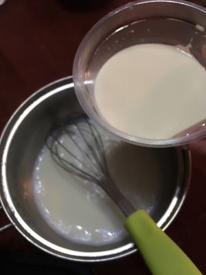 牛奶和细砂糖混合后关火,加入淡奶油。