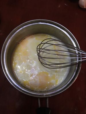 淡奶油、牛奶、白砂糖,蛋黄搅拌至白砂糖完全融化