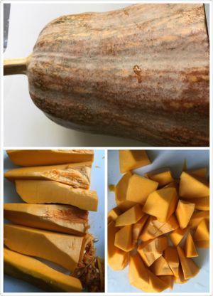从市场买回新鲜南瓜,削皮、去籽,切成小块。