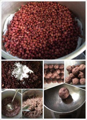 把红豆泡水一天,放高压锅上蒸熟。打成泥状、倒入白糖,加少许猪油、搓成丸子。