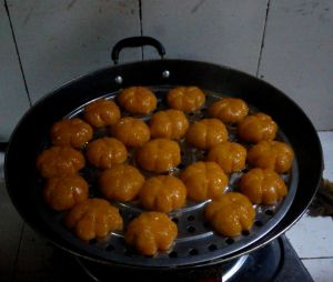 把蒸熟的南瓜拿调羹压烂,趁热加白糖进去,搅拌