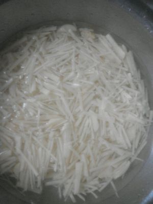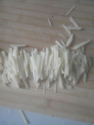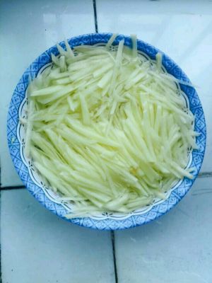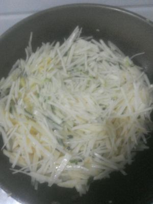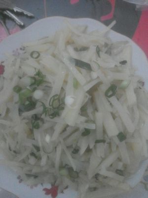 热锅后下泡好的土豆,快炒,然后加放点盐放蒜蓉和葱,再快炒至全熟就可以了