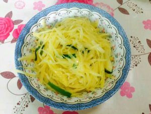 炒到土豆快熟时加入辣椒丝和葱段,翻遍均匀加一小勺盐炒均,出锅