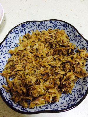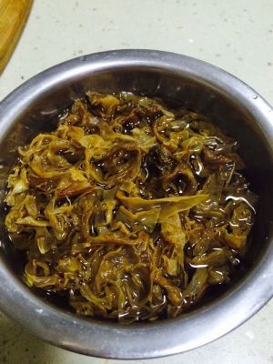 拿出一个适量的盘子,在盘底铺上一层泡发好的梅干菜;
