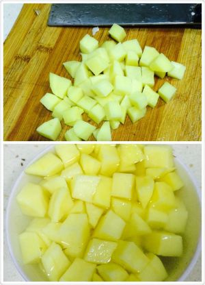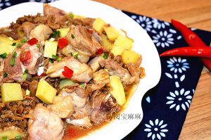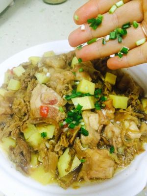 加入土豆,加盐,鸡精,刚才剩下的黄酒全倒锅里盖锅盖中火