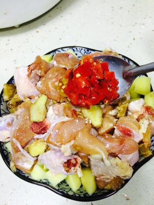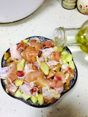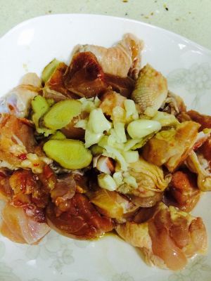 将剁好的鸡腿块放入盘中,加入1勺盐,1勺白糖、适量料酒、适量生抽、切几片生姜、大蒜放在鸡块里;