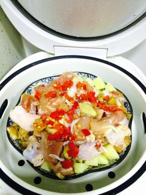 将装着梅干菜鸡腿的盘子放到电饭煲的蒸盖上,盖上锅盖,坐等美味;