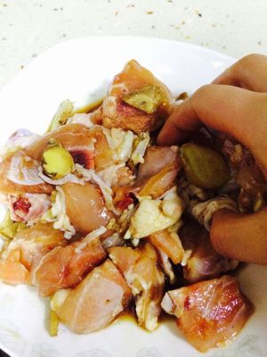 鸡腿切块,放入蚝油、料酒、盐,搅拌均匀再放入鹌鹑蛋,搅打均匀
