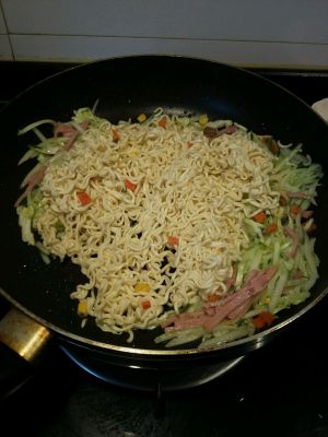 方便面事先煮至7分熟,倒入蔬菜里翻炒,加入生抽,盐,糖,茄子,胡椒粉,炒入味即可
