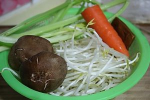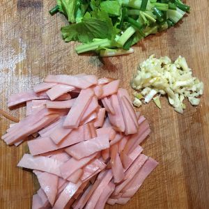 蒜头切碎,火腿切丝,香葱和芹菜切段备用。