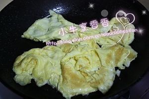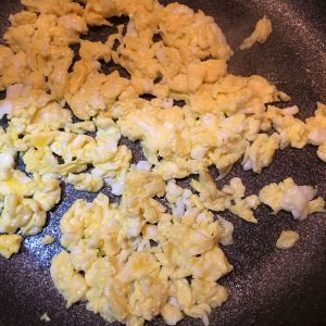 炒锅加入少许食用油,大火烧热,打入鸡蛋炒散,盛出备用。