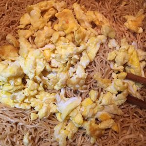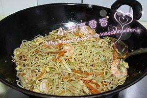 鸡蛋炒好,在煮好面的面水里面汆烫虾仁至熟后捞起;