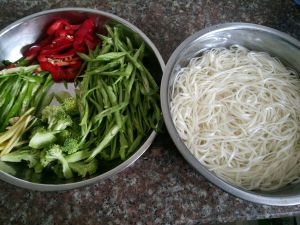 准备工作,面条煮半熟,长豆角斜切刀,青、红辣椒切丝,西兰花切好。