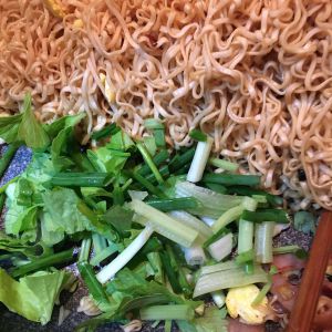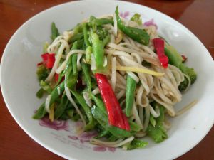 锅热后,先放入豆角,西兰花,青、红辣椒炒好,然后加入面条加些生抽,盐翻炒一会儿,入味后出锅装盘。