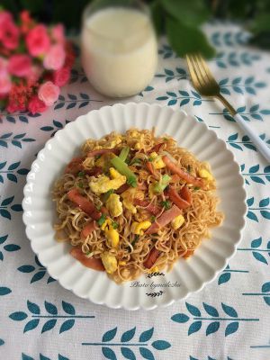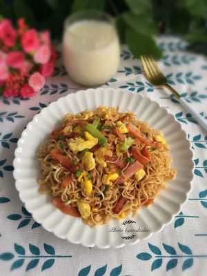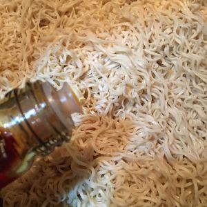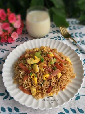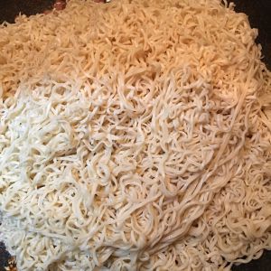 放入盐,耗油和两包方便面里面的酱包,记住只要酱包就好,然后再次翻炒均匀
