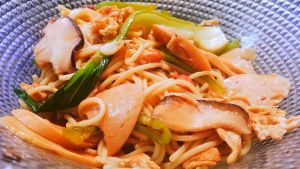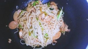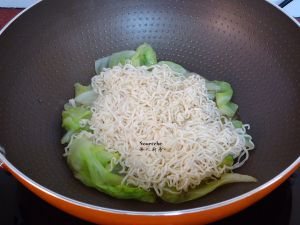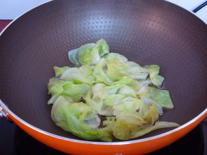 待菜全熟并入味后下入面条,中小火翻炒,使面条均匀沾满酱汁