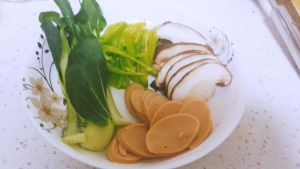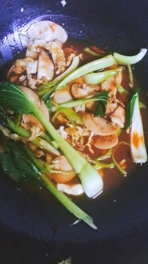 香菇,鸡肉肠切薄片,尖椒切丝,唐油菜中间剖开,小油菜的话整根也行