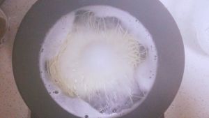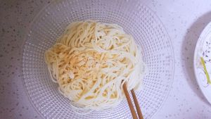 将面条放入沸水中煮熟,浸入凉水中,可使面条更加劲道。随后沥水备用