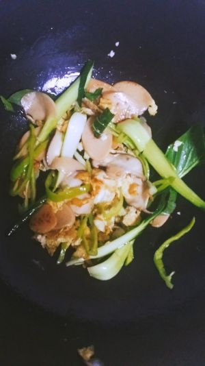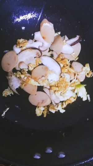 先下香菇片和肠翻炒,肠可以煎焦一点