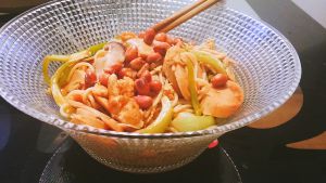 洋葱,青椒,圆白菜切丝,葱蒜切末,面条下锅煮,八分熟捞出过水。虾仁由于买来就是煮熟的,所以不用腌制去腥。